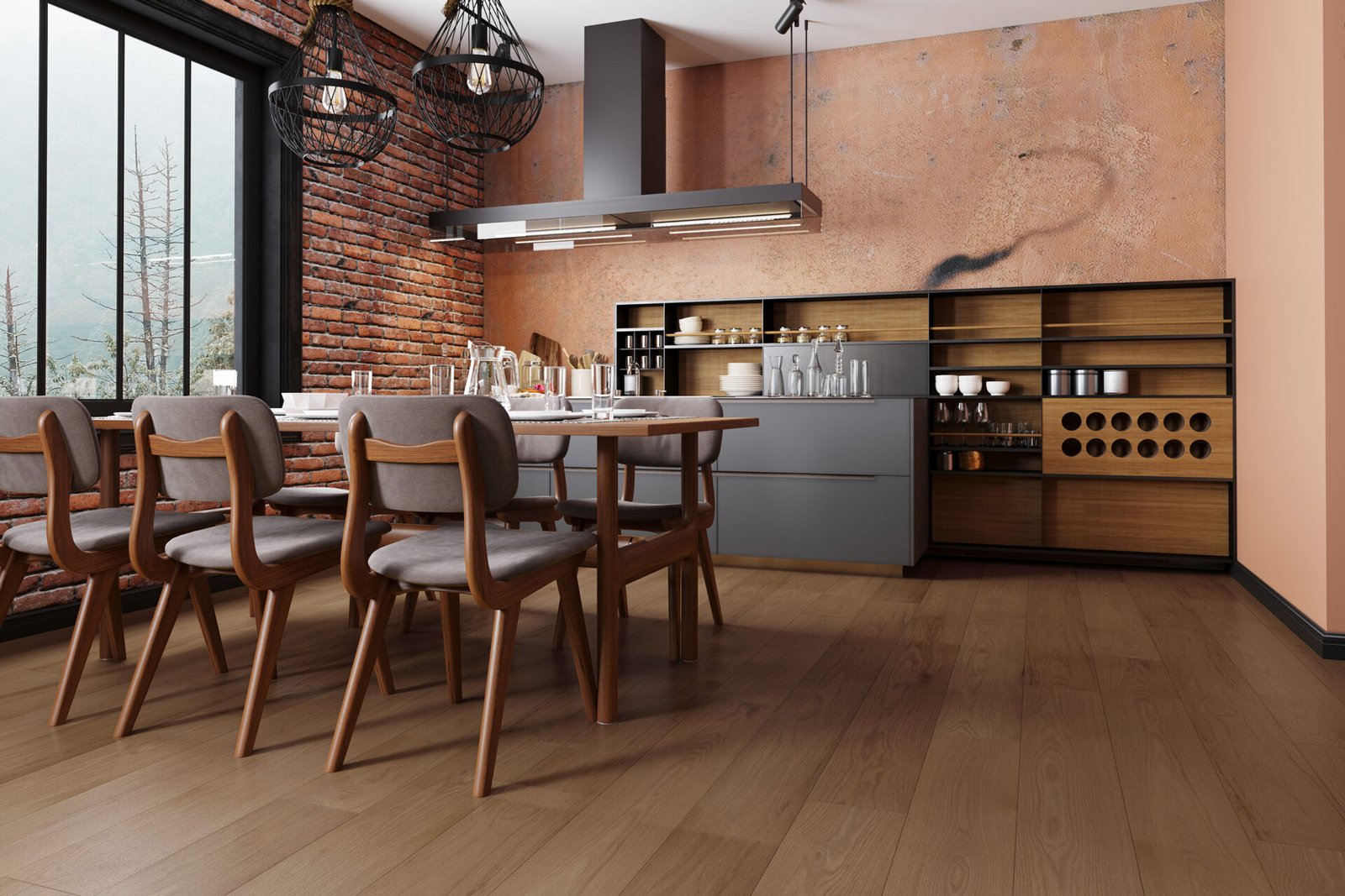 Warm-toned American Oak Engineered Flooring in Hermosa finish. Wide-plank design, durable construction, and perfect balance of elegance and value.