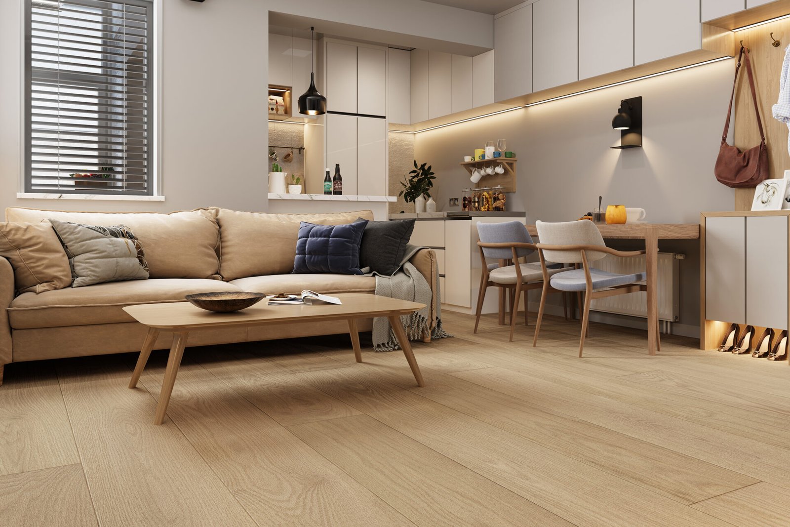 Warm and elegant American Oak Engineered Flooring in Ivory tone. Wide-plank design, authentic oak texture, and excellent stability for projects.