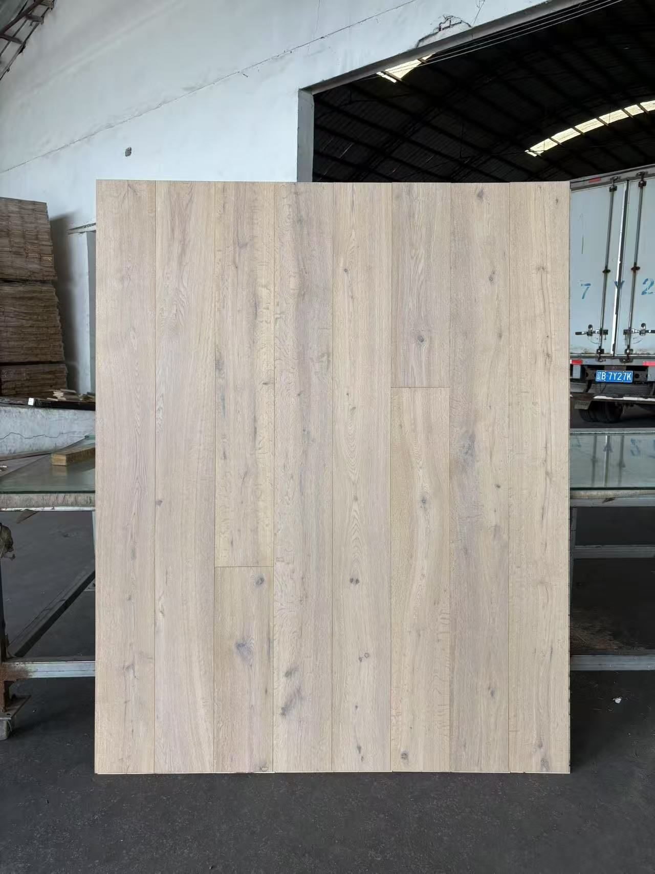 This Chinese Oak Three-Layer Engineered Flooring features a soft natural beige tone that highlights the gentle grain and clean surface of premium oak. The light, elegant color is perfect for modern interiors, especially for designers and project buyers who prefer a bright, neutral aesthetic.