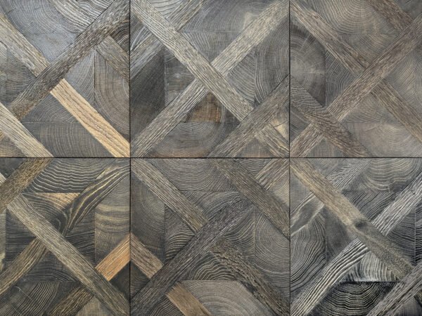 A bold carbonized Versailles-pattern end grain floor with birch core and underfloor heating compatibility—designed for luxury interiors.